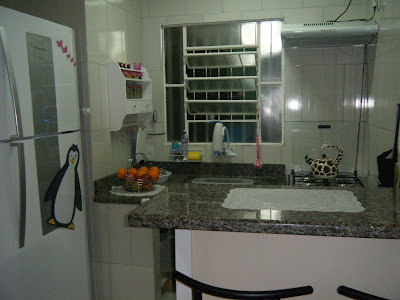Essa é a minha mini cozinha, realmente mini, mesmo, os armários que falei nao serviriam aqui de jeitoooo nenhum, pra otimizar espaço, fiz uma bancada de granito e o balcão de pia, foi substituido por um feito de alvenaria, ainda não fiz as portas neles, pois aqui em casa meu marido dá opinião em tudoooo, e ele nao quer as cortininhas que tento amo, acha feio, e por conta disso estamos num impasse...rsrsrsNa verdade, ja mandei fazer as cortinas, e vou mostrar a ele colocadas, mas só vou fazer isso sexta feira, já que ele vai arrancar 2 dentes e estará um tanto sensivel nao acham??
