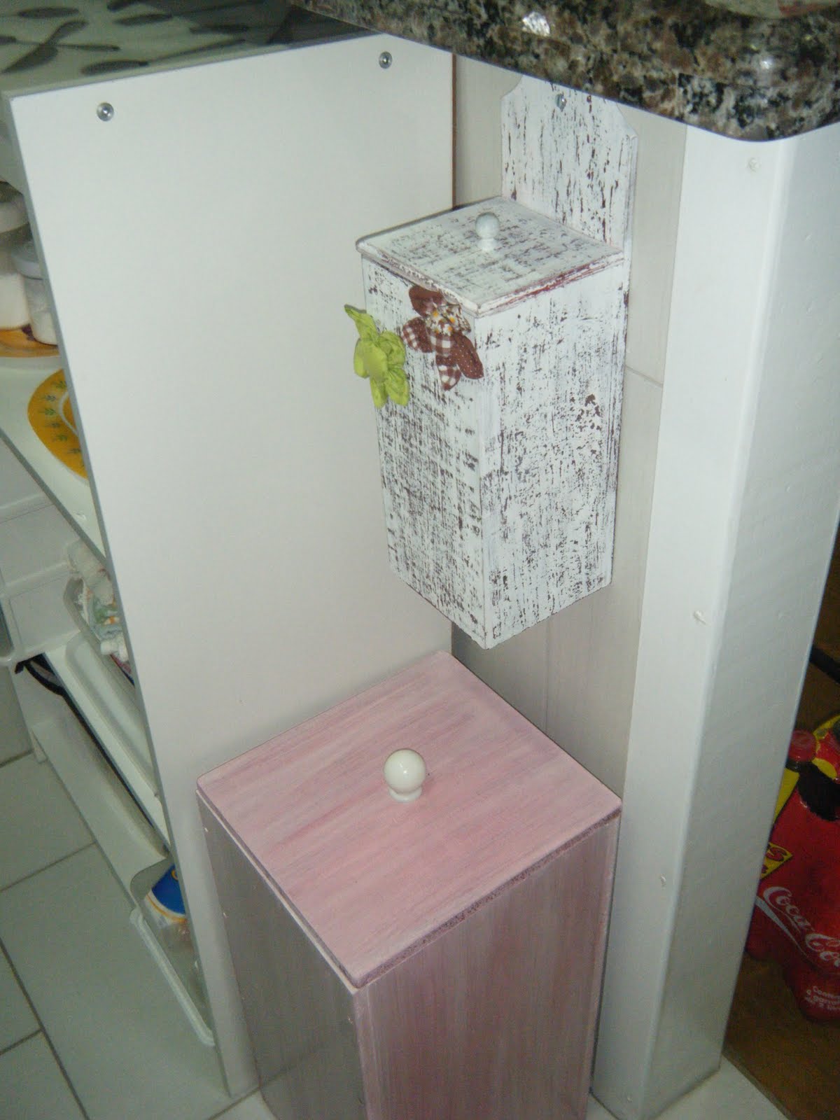 Ao lado coloquei essa lixeira que meu marido fez e eu pintei, é só pra lixos secos, e em cima o puxa saco que pintei em pátina e coloquei uns fuxicos...