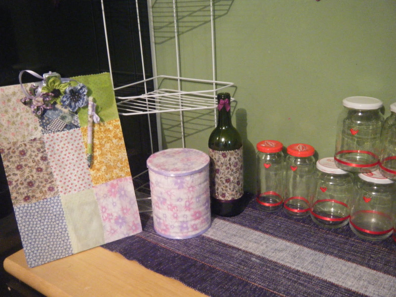 aproveitei e forrei uma garrafa e uma lata de leite...e coloquei umas fofuras nos potes de vidro, uso pra colocar coisinhas...
