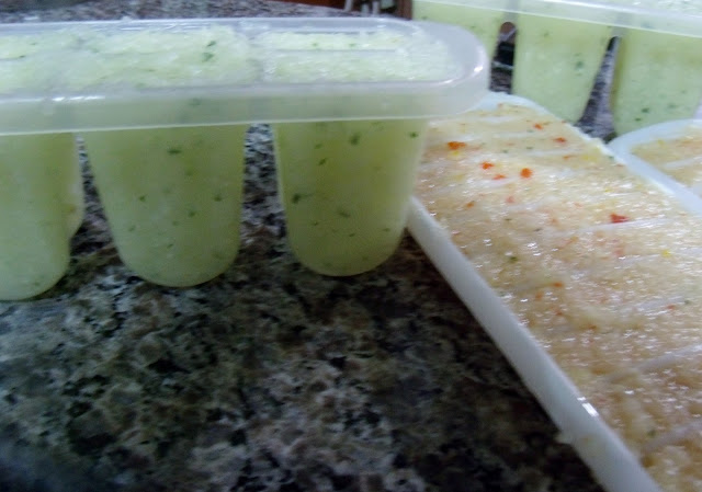 Separei duas forminhas de picolé e duas formas de gelo, uso só pra isso.Aproveito e faço temperos variados, pico pimentão também pois aqui se deixo ele in natura não aguenta muito, tem que congelar.